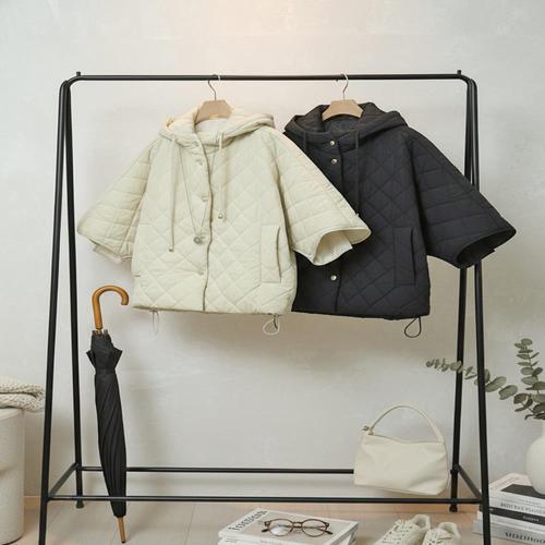 [옷자락] 여성 단색 누빔 포근 후드 끈 반팔 패딩 재킷
