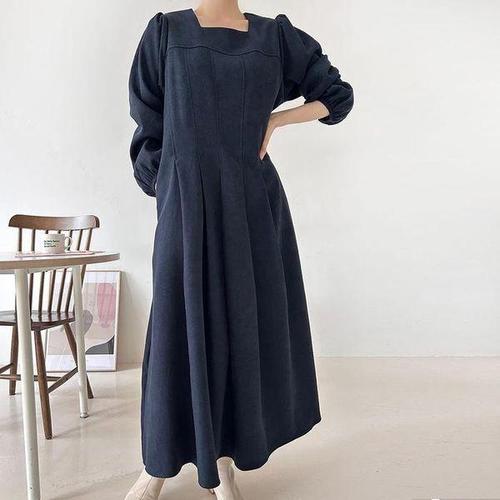 [신상오픈런]여성용 스퀘어넥 플리츠 골덴 퍼프 롱 원피스 빅사이즈
