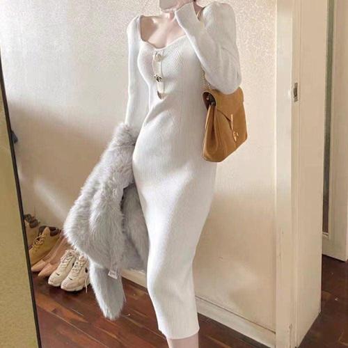 여성 니트 스퀘어넥 롱드레스 하객룩 슬림핏 원피스 WFKORQ4