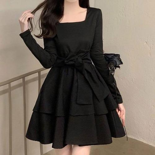 채핏 마지렌 벨트세트 원피스 섹시 글램 미니 ops 긴팔 리본 벨트 스퀘어넥 플레어 a라인 데이트룩