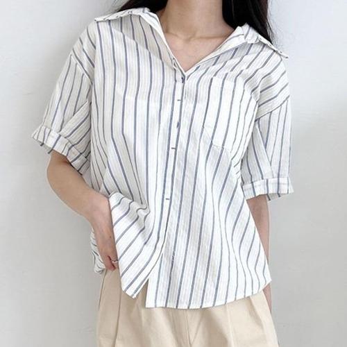 [엄지척]여성 봄가을 카라 블라우스 짧은소매 스트라이프셔츠_19660447_667501
