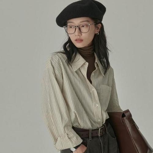 [엄지척]베이직 루즈핏 긴팔 스트라이프 셔츠 카라 블라우스_19651138_667501