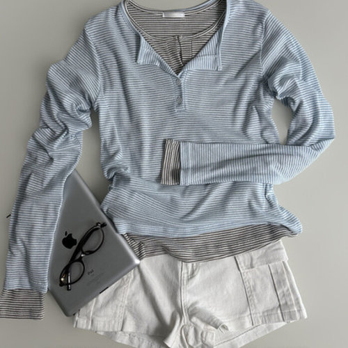 더핑크 / 에노 버튼 스트라이프 썸머 긴팔티