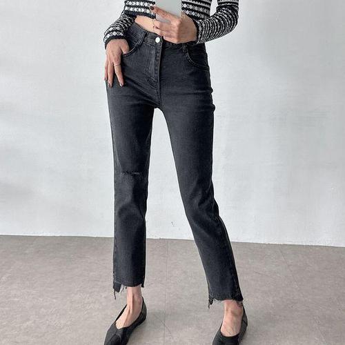 [다잇템_패션]여자 슬림 세미 검정데님 나팔 컷아웃 청바지