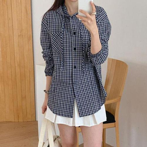 [셀러허브_여성트랜드패션]여자 격자 주머니 언발 힙커버 후드남방 셔츠