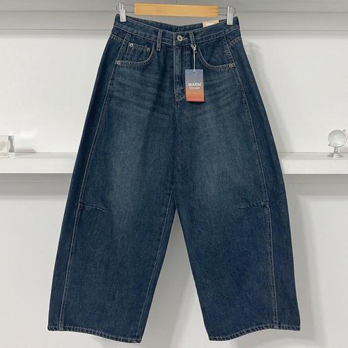 [옷자락] 여성 절개 볼륨 와이드핏 9부 크롭 기모 겨울 청바지