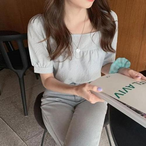 [엄지척]여성 여름블라우스 스퀘어넥 셔링 반팔셔츠 체크남방_19652036_667501