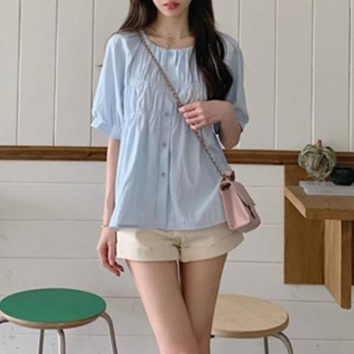 [엄지척]여성 블루 반팔셔츠 셔링 여름 캐주얼 20대 출근룩_19650533_667501