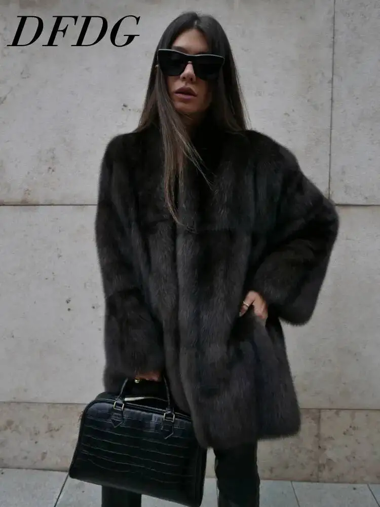 DFDG 여성용 2025 가을 겨울 우아한 럭셔리 인조 모피 코트 두꺼운 스탠드 칼라 긴 소매 따뜻한 스타일리시 모피 코트