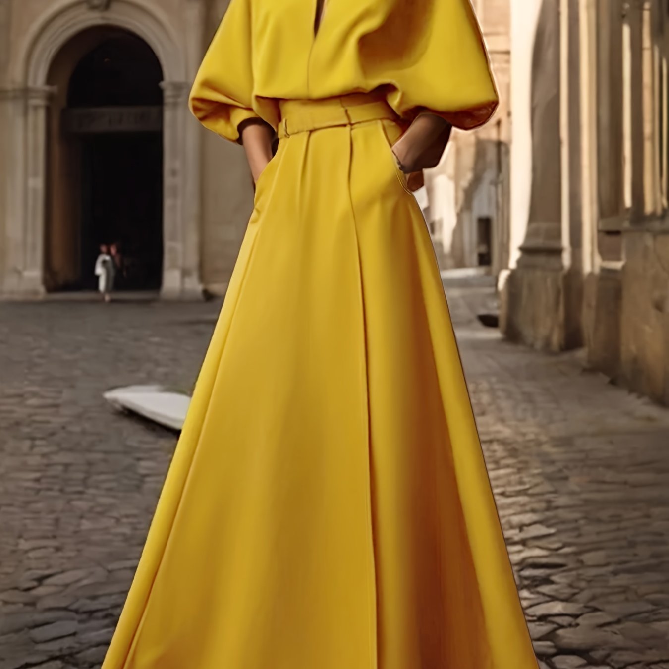 TEMU 여성용 우아한 크로스 넥 벨트 A라인 드레스 - 생기 넘치는 노란색 솔리드 컬러, 긴 소매 오피스 투 이브닝 웨어, 세탁기 사용 가능 봄/여름 드레스, 세련된 패션, 정교한 재단