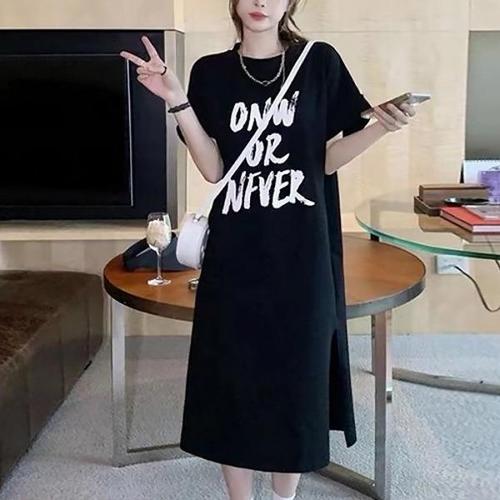 [엄지척]여성 귀여운 캐주얼 영문 레터링 롱 트임 반팔 원피스_19869736_667501