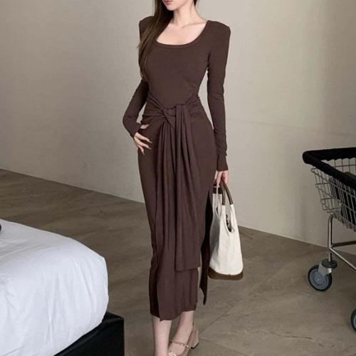 [셀럽하우스]여성 ZJVX9953 골지 롱원피스 허리스트랩 소매단추 옆트임
