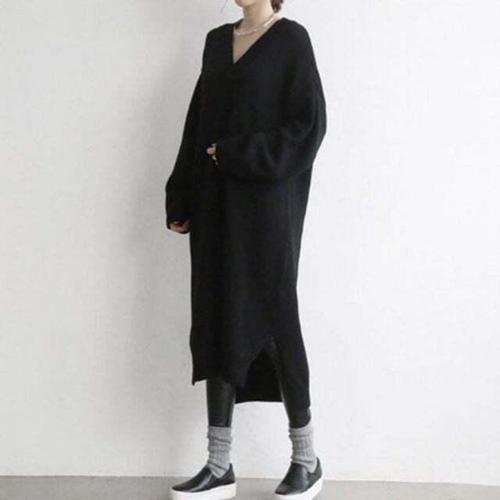 MINA STYLE 브이넥 원피스 니트 롱 옆트임 여성 긴팔 데일리룩
