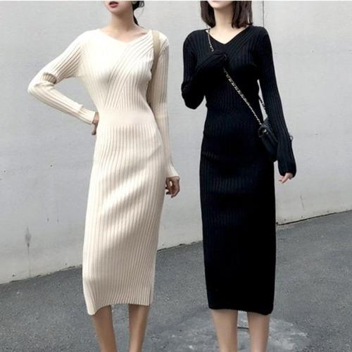 [엄지척]여성 슬림핏 예쁜 브이넥 골지 니트 긴팔 롱 원피스_19910099_667501