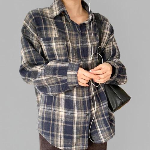 [옷자락] 여성 가을겨울 오렌지그린 체크 루즈핏 셔츠