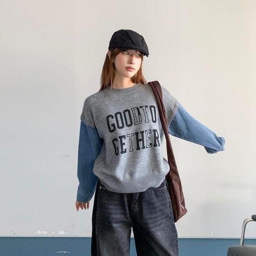 [옷자락]여성 오버사이즈 데님소매 라운드넥 긴팔 니트