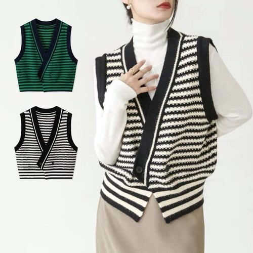 [셀럽하우스]여성 IVQS7813 줄무늬 니트 베스트 V넥 나시 조끼 루즈핏 단추
