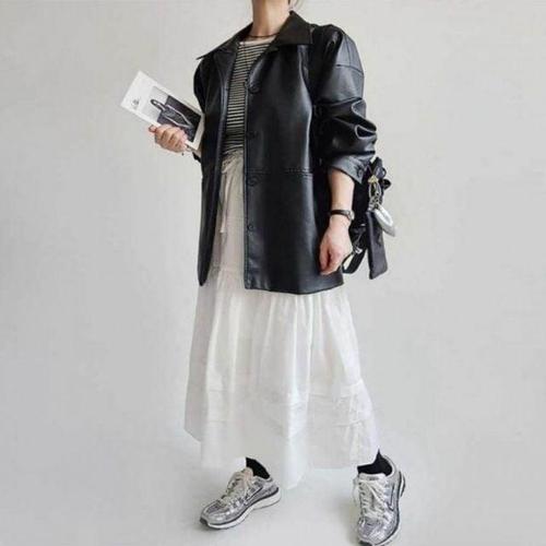루즈핏 블랙 PU 가죽 재킷 여성용 봄 가을 패션 스트리트 스타일 레트로 디자인 긴 소매 수트 코트