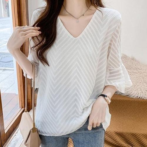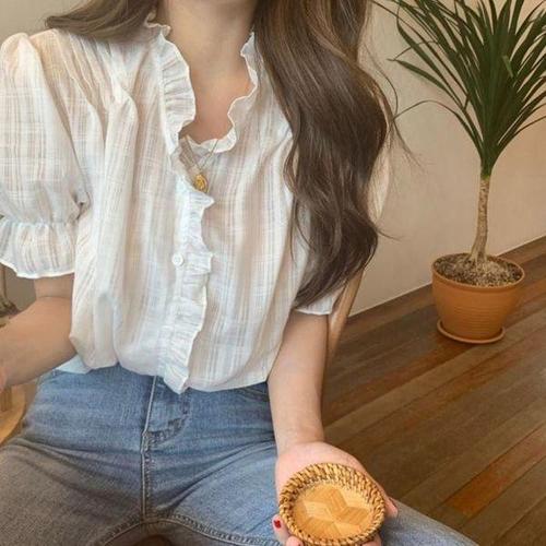 [셀러허브_여성트랜드패션]여자 얇은 루즈핏 블라우스 반팔 여름 프릴 V넥