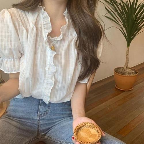 블라우스 프릴 얇은 루즈핏 V넥 반팔 여름 여자 WFLQ87B