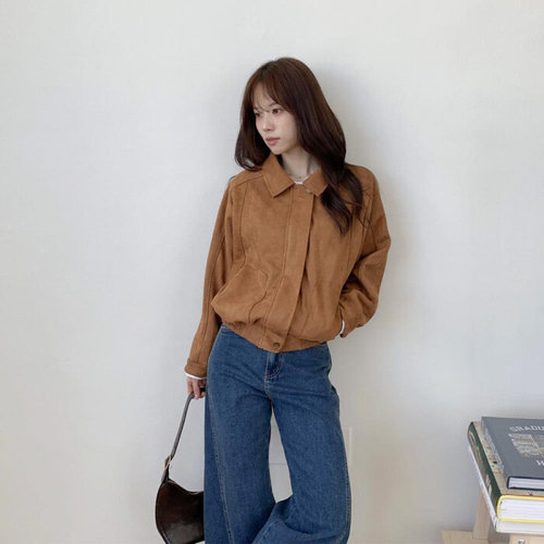[모노폴로지]투웨이 세무 스웨이드 캐주얼 오버핏 크롭 지퍼 블루종 트러커 카라 절개 자켓 2color