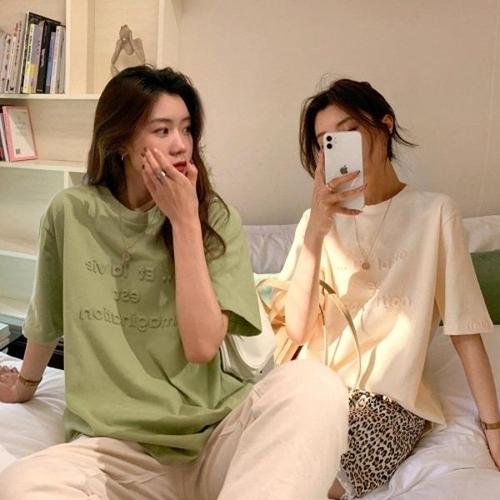 [엄지척]여성 엠보 레터링 라운드넥 오버핏 여자 반팔 티셔츠_19610415_667501