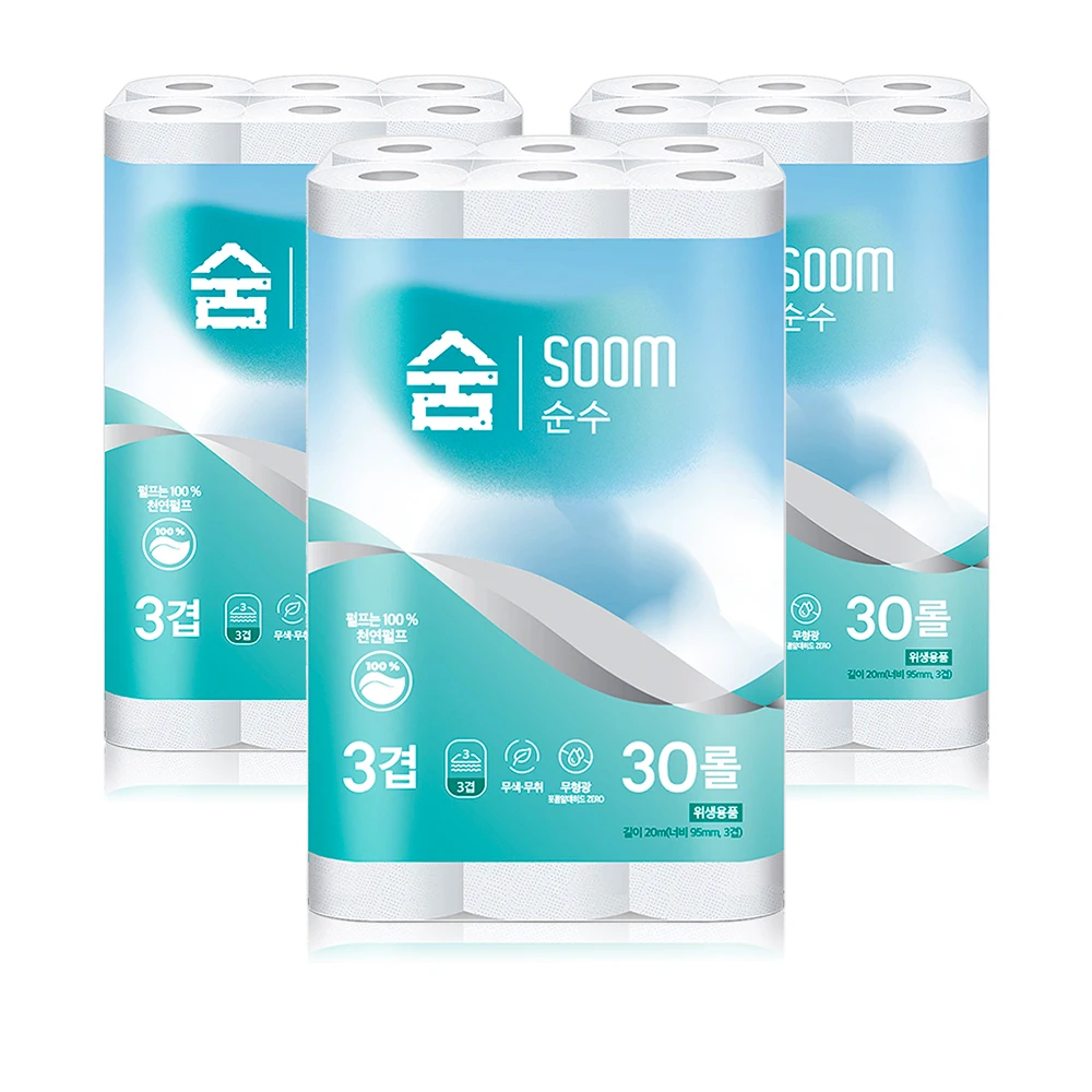 [빠른배송] 100% 천연펄프 무형광 숨 순수 3겹 20m 30롤 1 + 1 화장지 휴지 두루마리