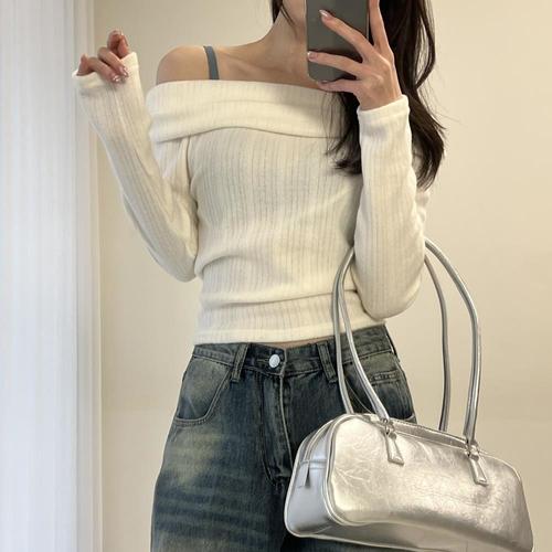 [옷자락] 여자 가을 데이트룩 골지 오프숄더 사선 긴팔 니트
