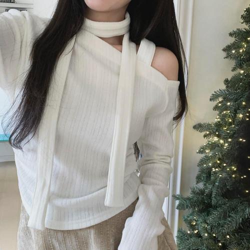 [옷자락]여성 패션 여성스러운 여리핏 스카프 오프숄더 니트