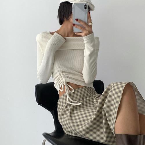 [신상오픈런]|KST99F1|여성 오프숄더 롱슬리브 슬림핏 골지 옆셔링 디자인