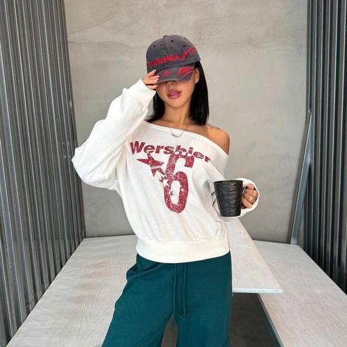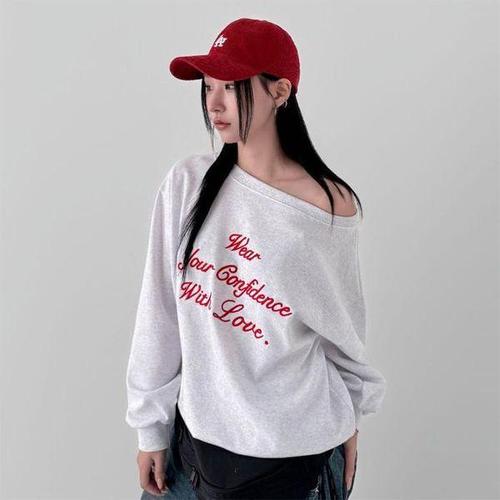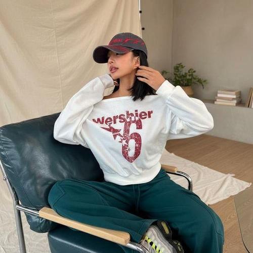 [셀러허브_여성트랜드패션]여성 자수 글씨 오프숄더 배색 봄 맨투맨