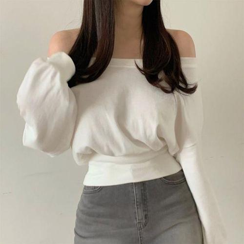 [신상오픈런]여성 오프숄더 퍼프 맨투맨 가을용 와이드 밴딩 면 티셔츠
