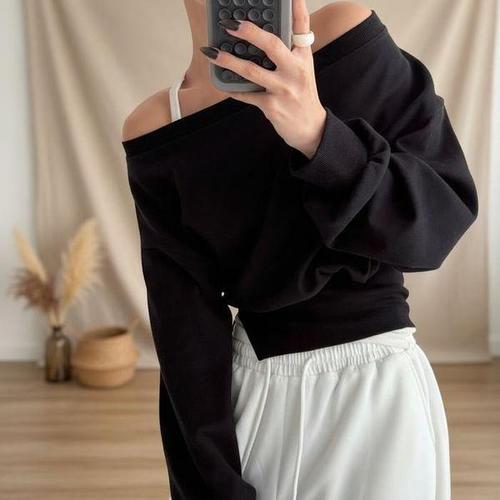[셀러허브_여성트랜드패션]여성 오프숄더 무채색 크롭 맨투맨 슬림 봄용
