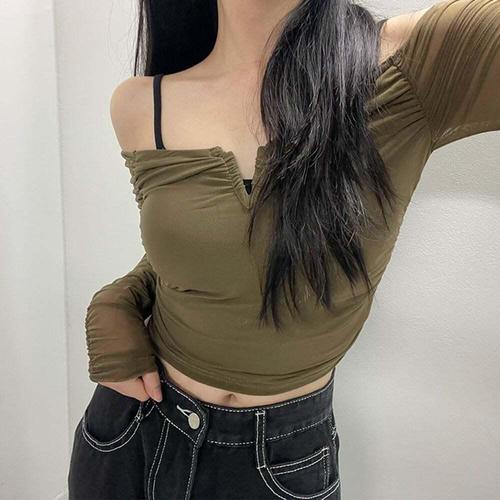 [셀럽하우스]에이티 TXXV0393 브이넥 시스루 오프숄더 크롭 블라우스