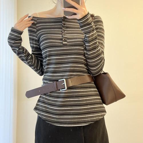 [옷자락] 여자 오프숄더 나그랑 버튼 루즈핏 벨트 긴팔 티셔츠