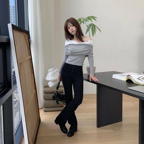 티셔츠 슬림핏 쵸커티셔츠 오프숄더 크롭 긴팔티 (3lNmx)