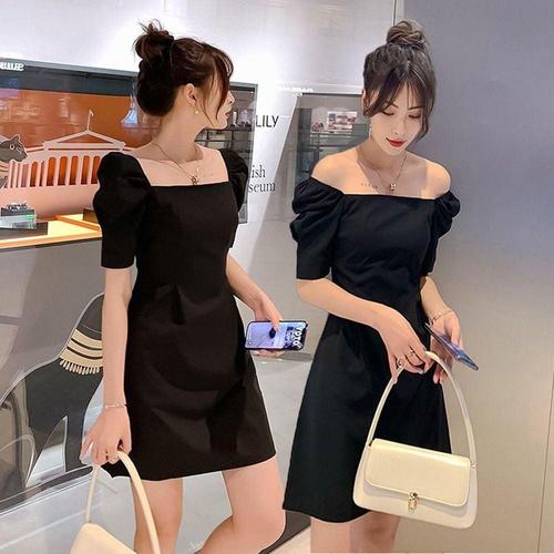 퍼프 오프숄더 블랙 핀턱 스퀘어넥 여자 미니원피스 WFLOZQ6