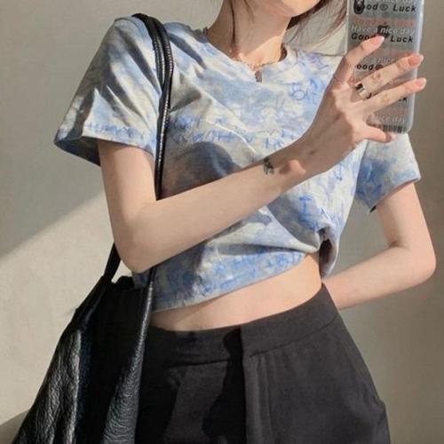 [엄지척]여성 숏 하이웨스트 나염 염색 블루 세미 크롭 반팔티_19611399_667501