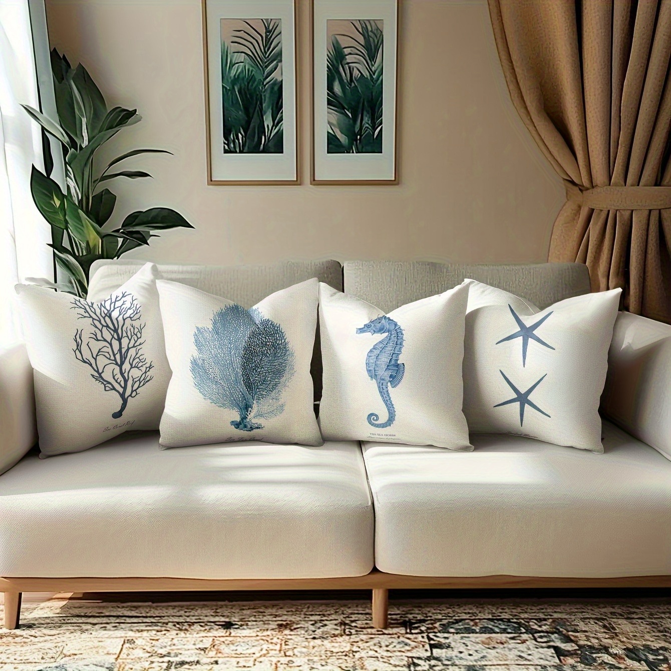 TEMU 4pcs 빈티지 오션 트레저스 스퀘어 베개 커버, 세련된珊瑚 해마 별어류 디자인, 기계 세탁 가능한 폴리에스터, 지퍼 클로저, 거실, 해안가 홈 데코용 장식 베개 커버