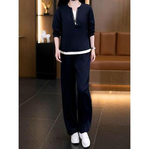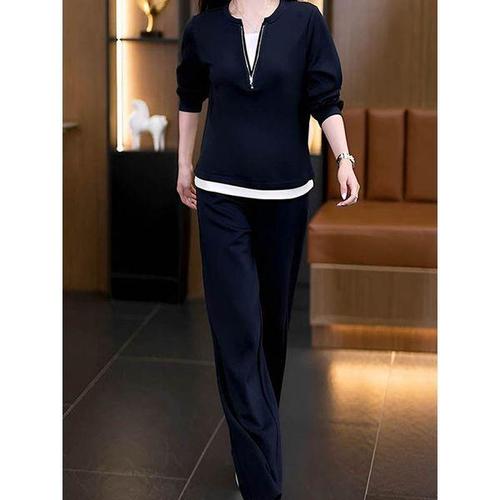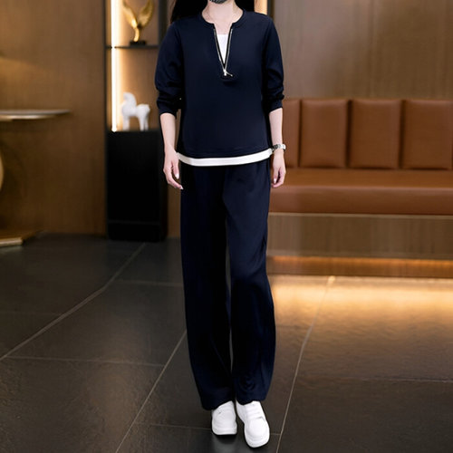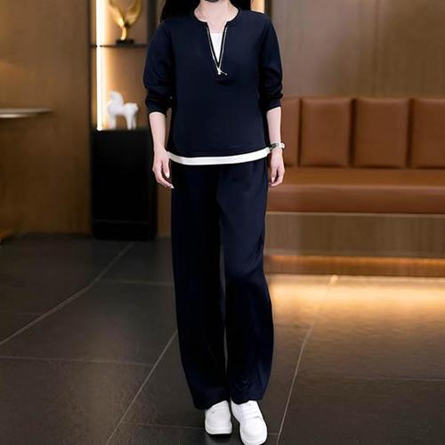 한국 스타일 겨울 의상 여성용 지퍼 긴팔 스탠드 칼라 스웨트셔츠 캐주얼 와이드 레그 팬츠 투피스 세트