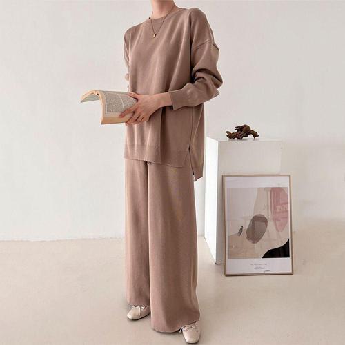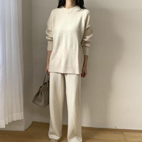 [문에이블]문에이블 여자 여성 겨울 편한 루즈핏 라운드넥 긴팔 니트 와이드 밴딩 팬츠 투피스 세트