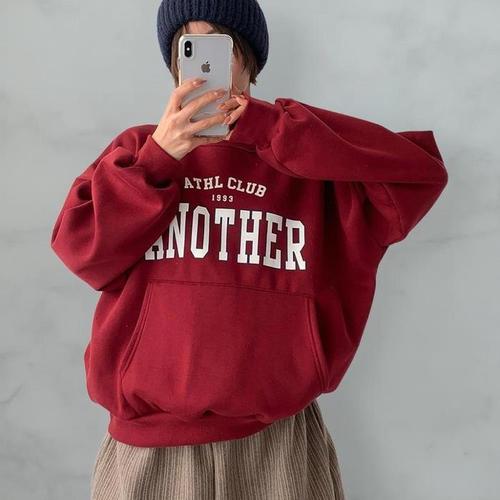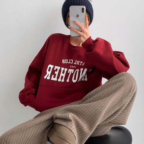 [옷자락] 여성 겨울 기모 맨투맨 와인색 캥거루 포켓 레터링 스웨트셔츠
