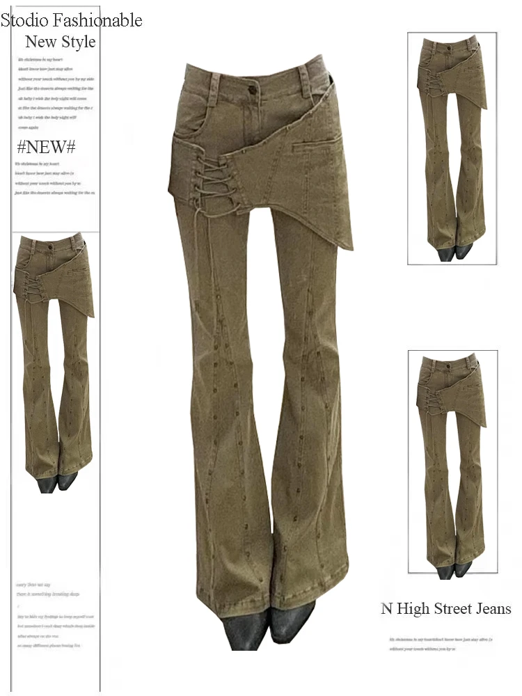 가을 겨울 여성 고블린 코어 로우 웨이스트 플레어 데님 팬츠 패치 워크 일본 Abi Y2k 하라주쿠 벨 바텀 스키니 진 그런지