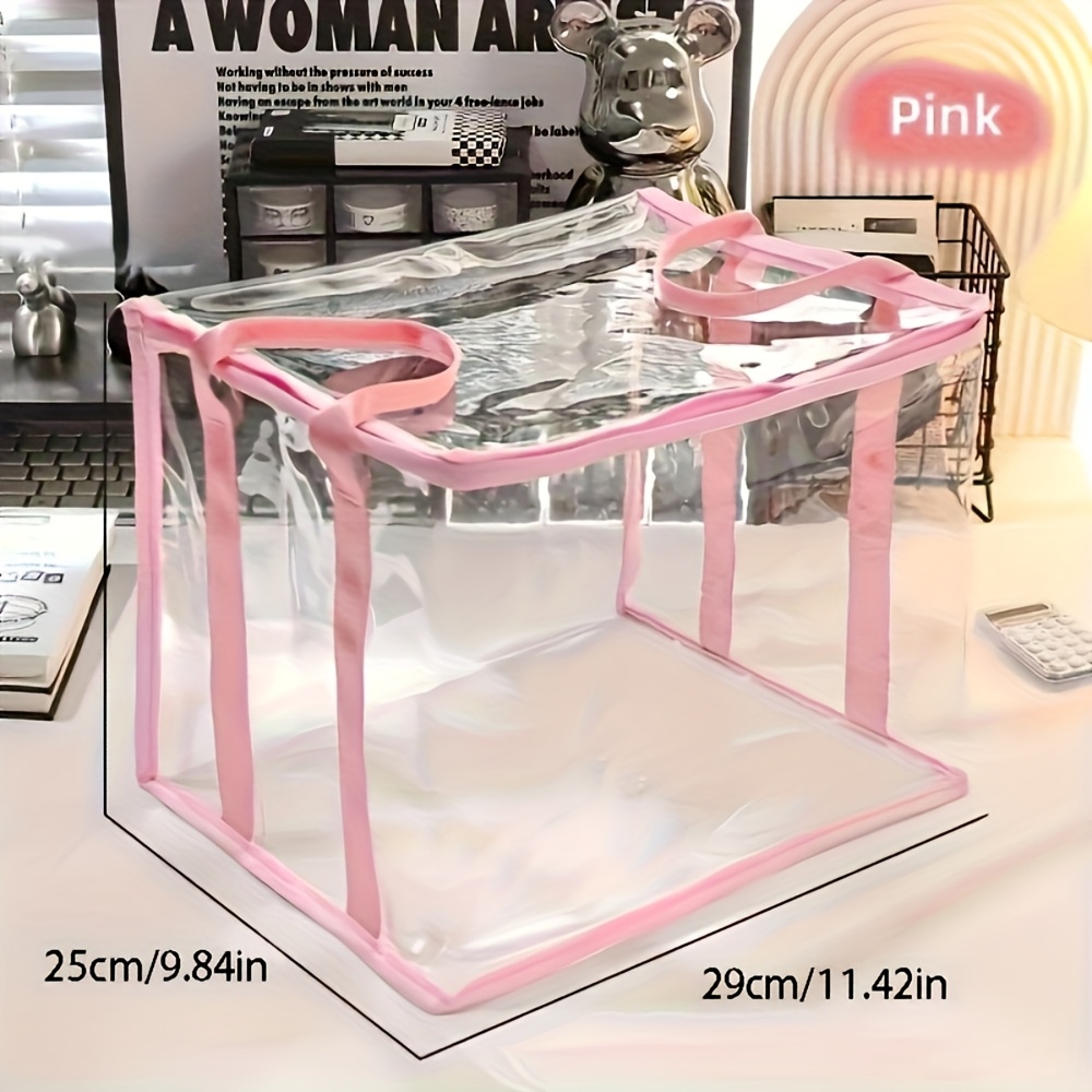 TEMU 1pc 접이식 투명 보관함, 핑크 핸들 및 뚜껑이 달린 내구성이 뛰어난 대형 플라스틱 정리함, 책, 장난감, 의류 및 기타 물품을 위한 휴대용 공간 절약 제품, 욕실, 침실, 거실, 출입구, 기숙사용