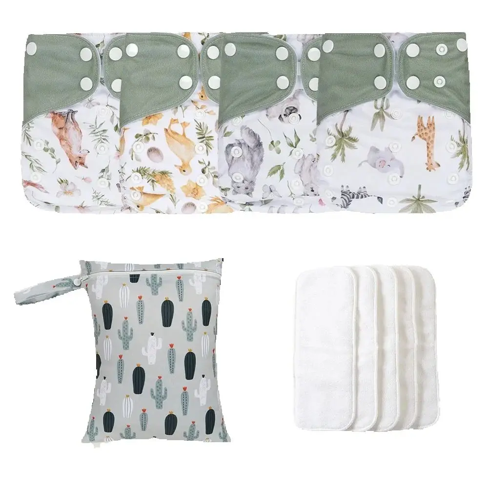 HappyFlute 4피스 빨 수있는 포켓 천 기저귀 세트 4개 삽입물 및 젖은 가방 신생아 아기 기저귀 커버 선물 세트