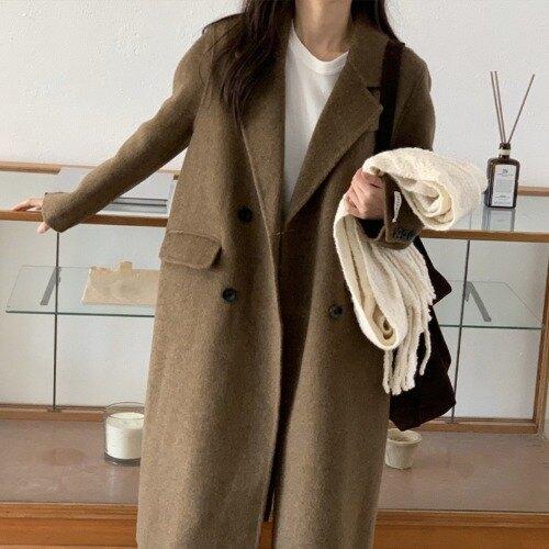 여성 울코트 캐시미어 여자 데일리 아우터 롱 겨울 울100 핸드메이드 더블 싱글 모직 하프 울 블랙
