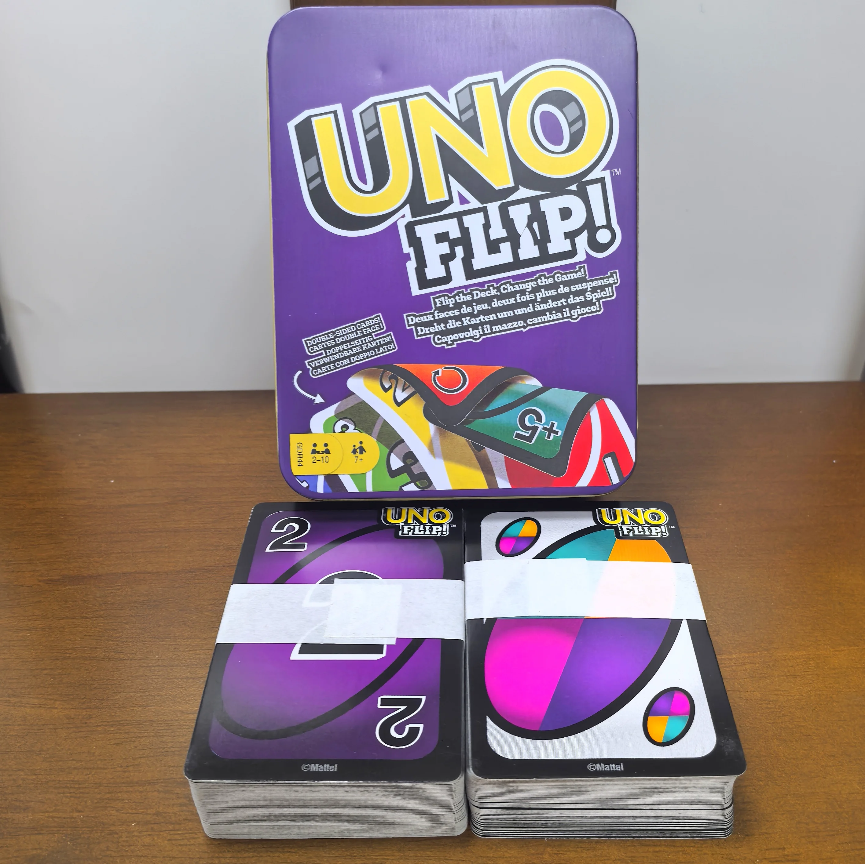 철제 상자 마텔 게임스 우노 플립 가족 카드 게임, 견고한 보관용 틴케이스에 112장의 카드 포함, 7세 이상 어린이에게 좋은 선물