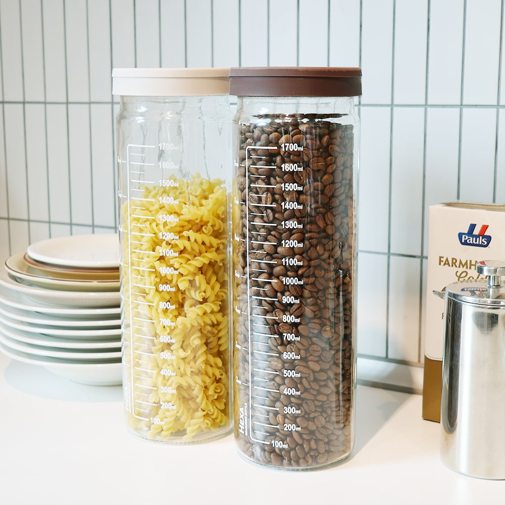 헥사 슬림 원통형 눈금 밀폐 유리병 1500ml 실리콘뚜껑 2종세트