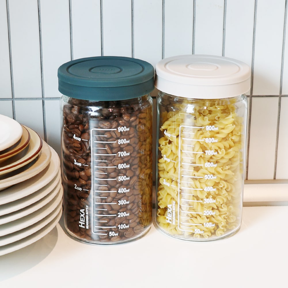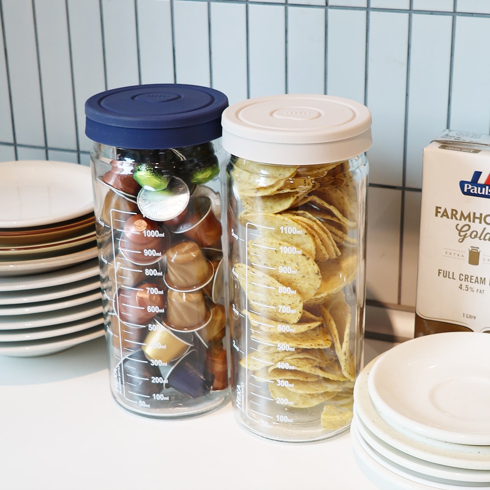헥사 슬림 원통형 눈금 밀폐 유리병 1000ml 실리콘뚜껑 2종세트