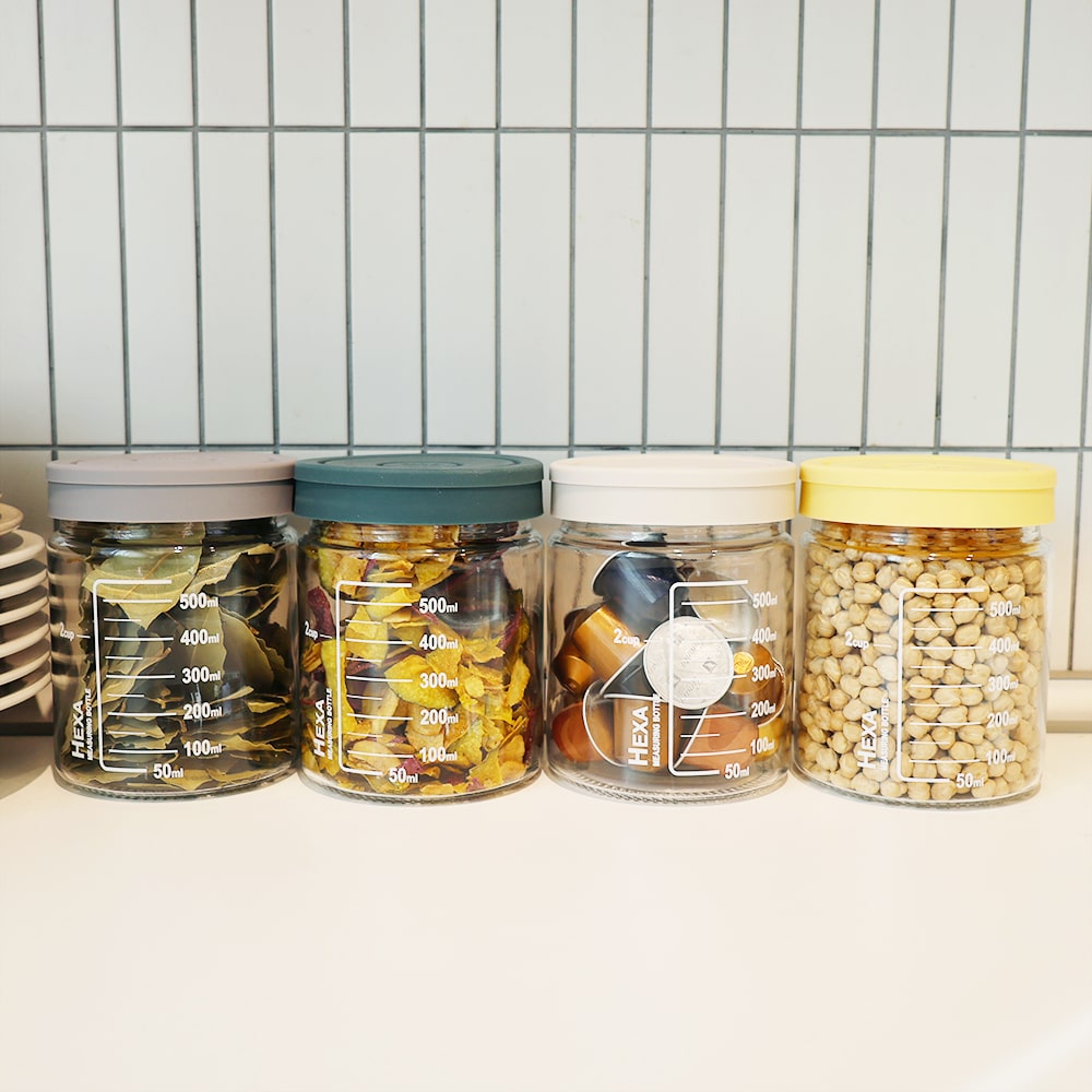 헥사 슬림 원통형 눈금 밀폐 유리병 700ml 실리콘뚜껑 4종세트